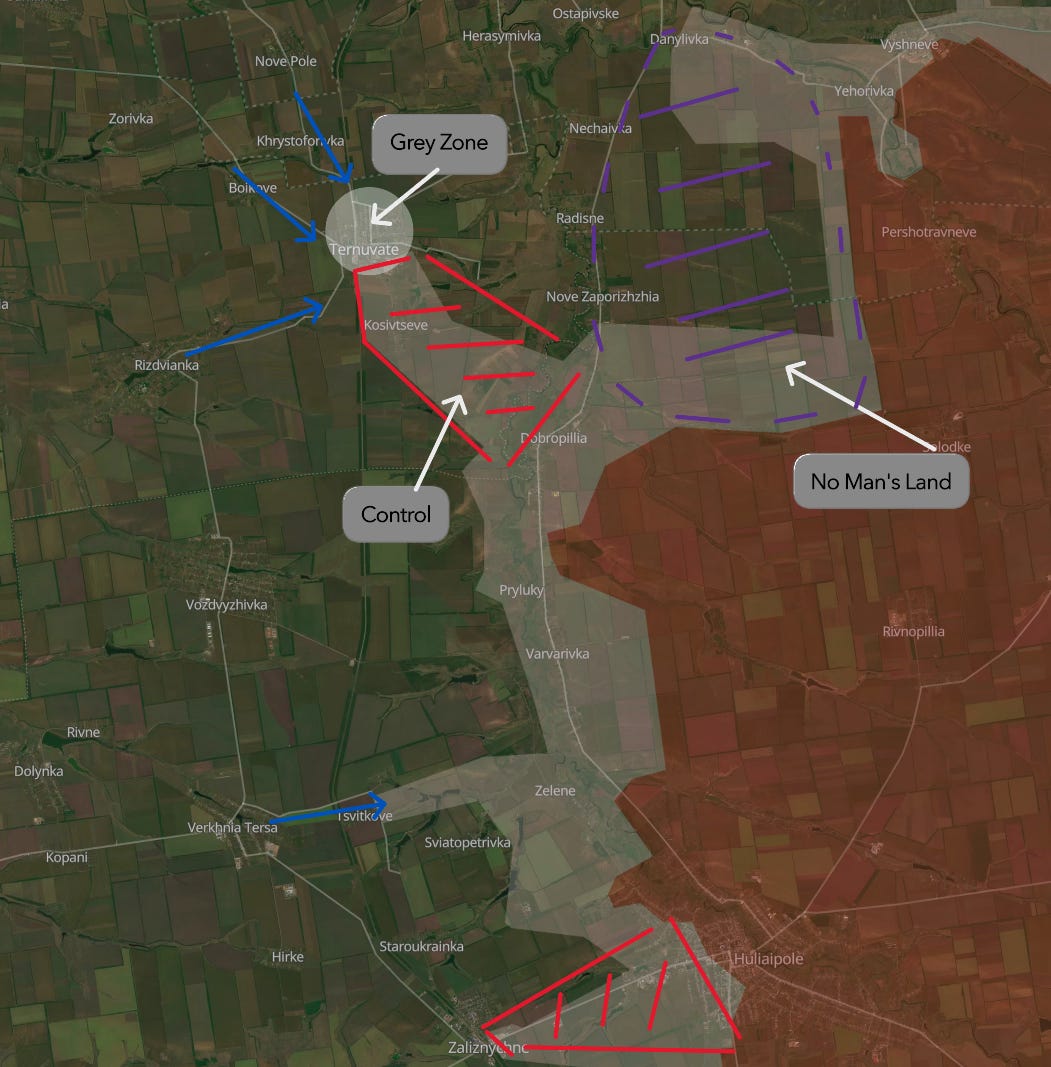 A doctrinal depiction would therefore show the village itself as a grey zone, since Ukrainian positions may still contest freedom of operations there. By contrast, the fields south up to the previous Russian FLOT should be marked as "controlled”, since no Ukranian positions capable to deny movement remained in this open areas, enabling forward assault groups to advance.