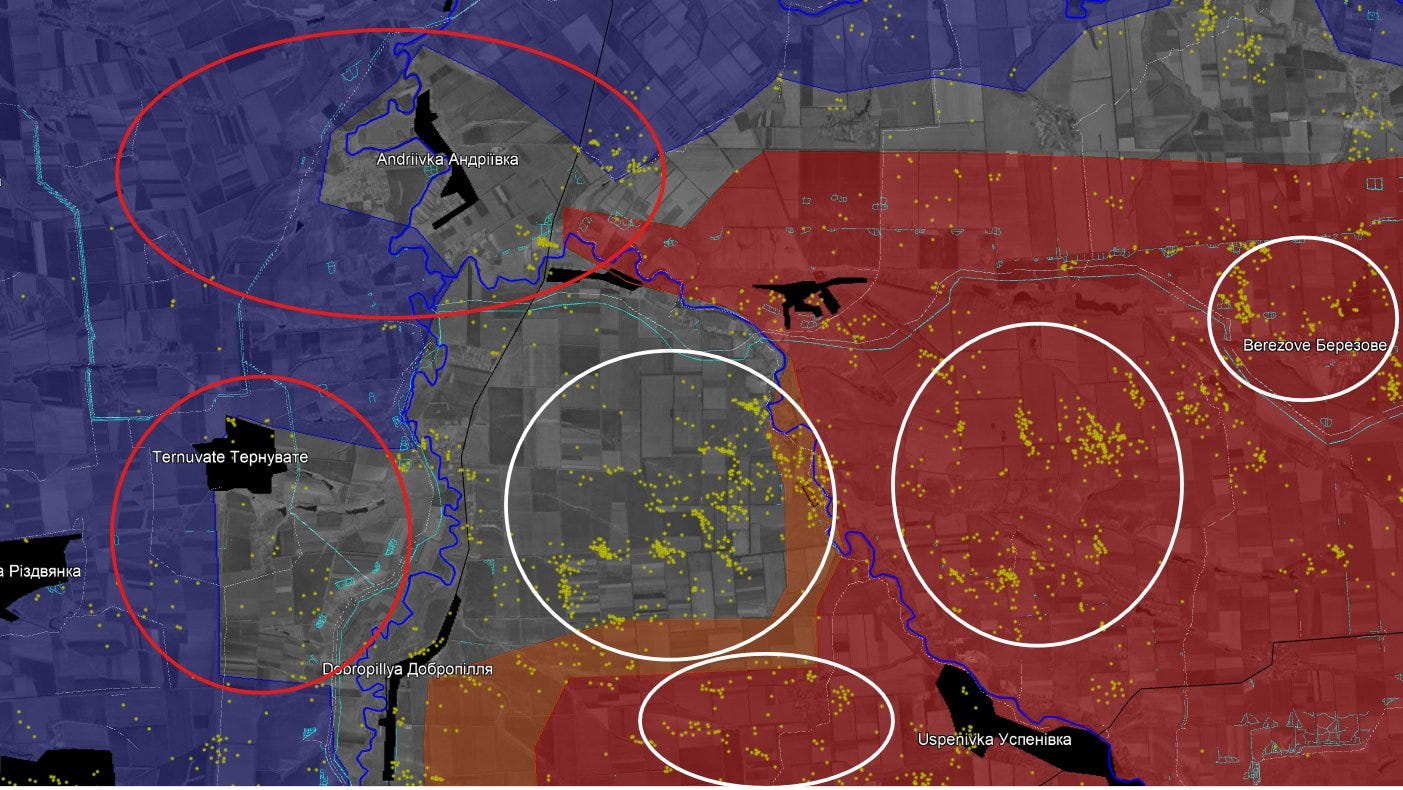 It is also important to point out that soldiers raising flags are not DRG (Deep Reconnaissance Groups), but forward assault groups. By definition, DRG do not reveal their positions to raise flags; but operate way behind enemy lines, for sabotage, targeting or mapping of enemy positions. In this instance at Ternuvate and the other villages the AFU had scarce positions able to stop progress, which were overrun by the small Russian units and drones. The extensive targeting of hideouts, and last mile logistics by Russian drones in recent months aims explicitly at weakening forward positions to support small assault tactics.